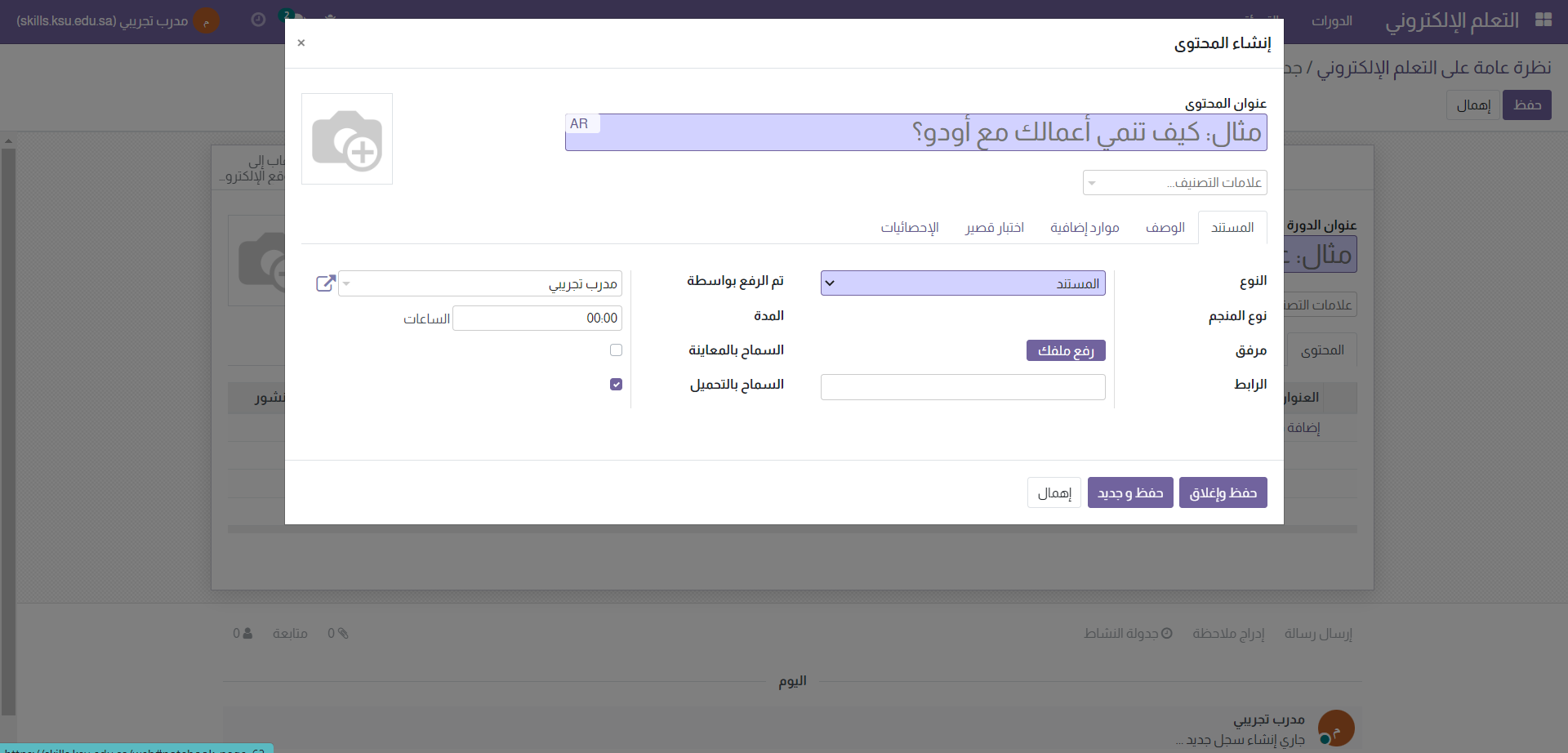 - في خانة المستند قم باختيار ووضع الاعدادات المطلوبة ( نوع المحتوى , رابط المحتوى , السماح بتنزيل المحتوى , مدة تنزيل المحتوى )