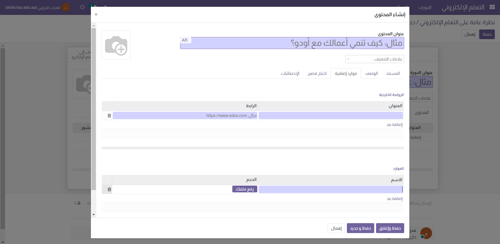 - في خانة الموارد الإضافية يمكنك رفع روابط او ملفات لنشرها للمتدربين