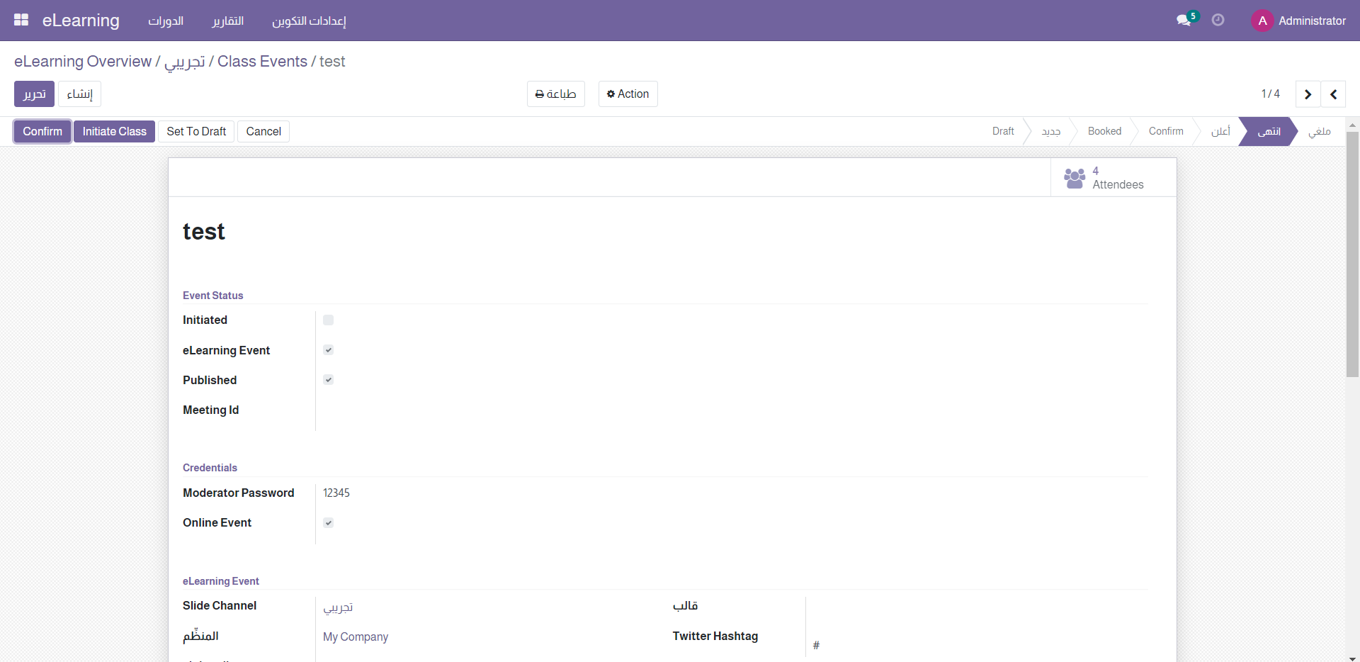 للرغة في التعديل على المحاضرة قم بالضغط على المحاضرة المطلوبة وستظهر صفحة البيانات ثم قم بالتعديل حيث يمكنك التالي : وضع باسوورد للجلسة , إضافة المحتوى للمتدربين , الية لتذكير المتدربين بالموعد والتاريخ عبر البريد الالكتروني الخ .. ثم قم بالحفظ